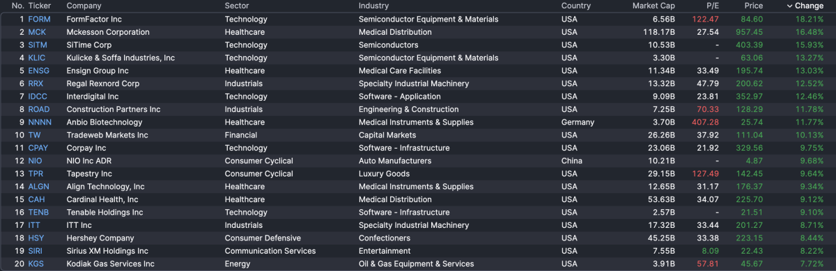 FormFactor (+18.21%), Mckesson Corporation (+16.48%), and SiTime (+15.93%) are at the top of the Midday Movers list today.