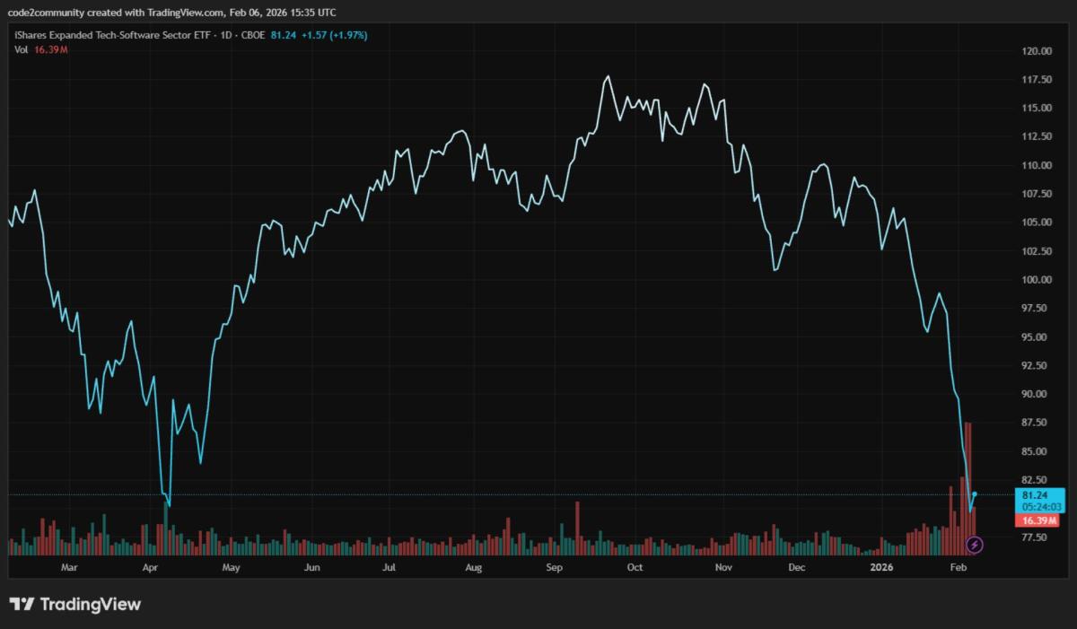 The risk has led to a mass exodus, clearly evidenced by the action in the iShares Expanded Tech-Software Sector ETF (IGV). It peaked near $118 last September. Now it trades below $80.
