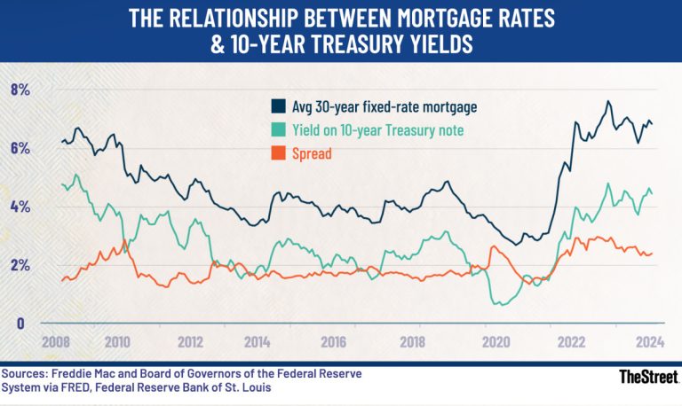 The Relationship Between Mortgage Rates & 10-Year Treasury Yields Chart.