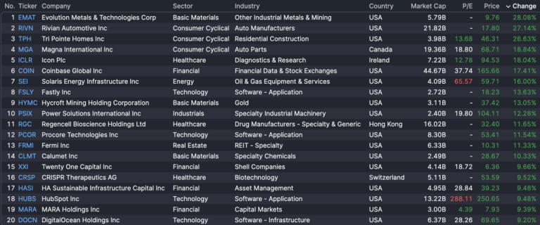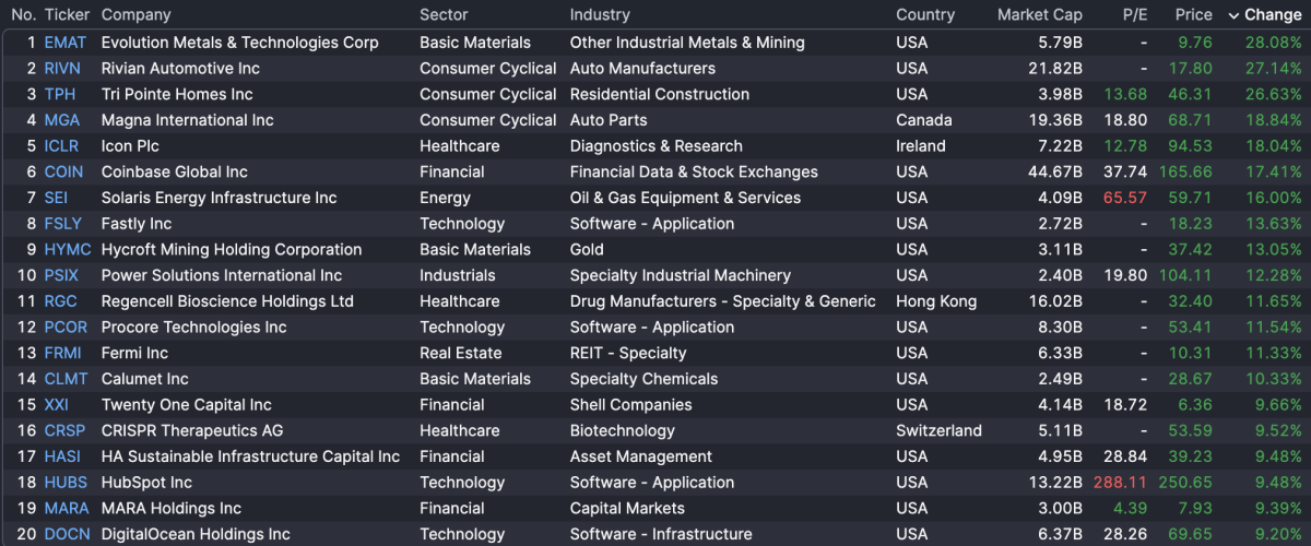 Evolution Metals & Technologies Corp (+28%) leads U.S. stocks today, flanked by Rivian Automotive (+27.1%), Tri Pointe Homes (+26.6%), and Magna International (+18.8%).